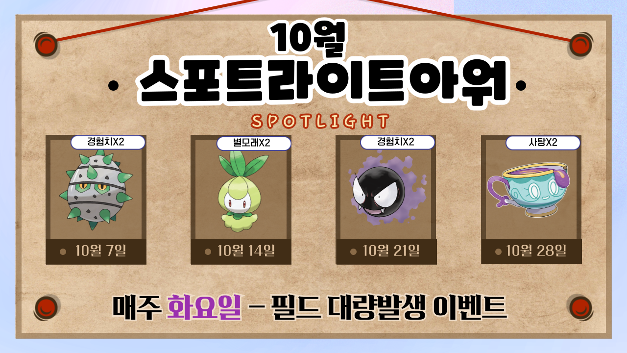 2025년 10월 21일 화요일 (오후 6시 ~ 오후 7시) | 포켓몬을 캐치 시 경험치X2로 획득합니다. |
