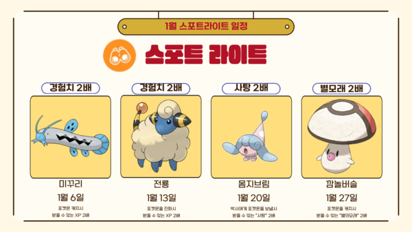 2025년 1월 27일 화요일 (오후 6시 ~ 오후 7시) | 포켓몬을 캐치 시 별모래 X2로 획득합니다. |